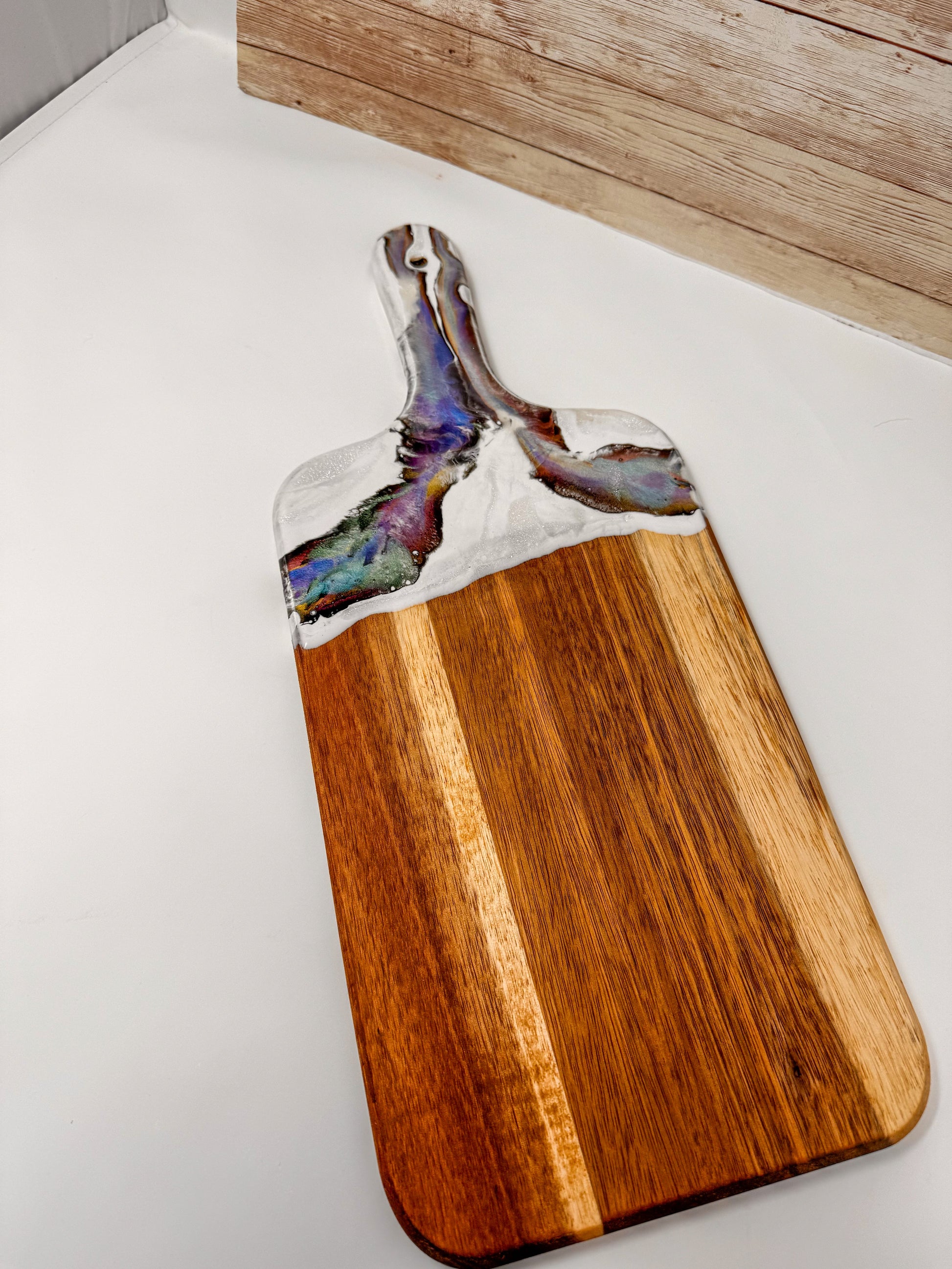 Acacia wood charcuterie board, with epoxy decoration.