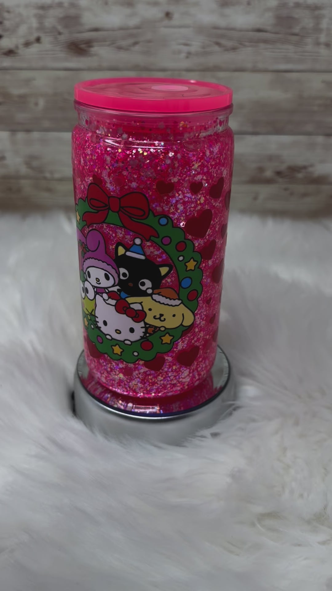 Hello Cat & Friends Christmas wreath - Pink/White Glitter - Snow Globe Cup - 12 oz Acrylic