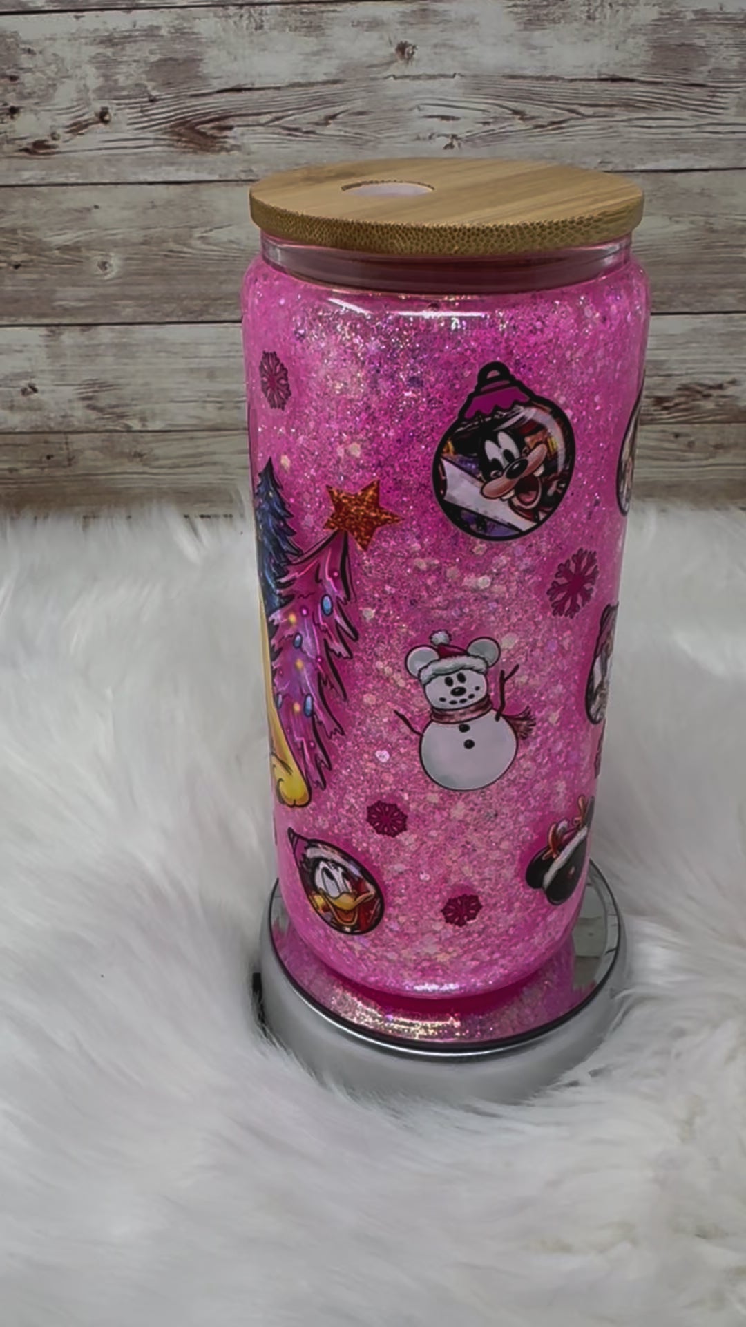 Mouse Christmas Dog - Pink Glitter - Snow Globe Cup - 16 oz Glass